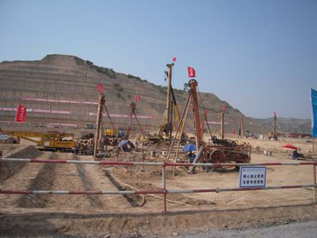 本工程我公司共完成φ1000mm和φ800mm共計1735根旋挖鉆孔灌注樁和沖擊鉆孔灌注樁,樁端持力層為砂巖,樁身為C30混凝土,19961立方米混凝土。