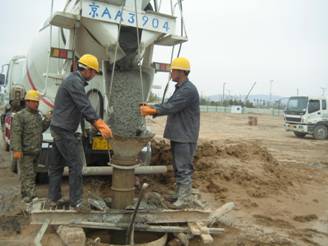 本工程原設(shè)計(jì)為干孔旋挖鉆孔灌注樁,試樁階段發(fā)現(xiàn)場(chǎng)地地表以下10米到14米位置存在大面積不確定位置的上層滯水,導(dǎo)致嚴(yán)重塌孔,經(jīng)設(shè)計(jì)院同意,改為泥漿護(hù)壁成孔水下旋挖鉆孔灌注樁并采用樁端后注漿工藝。施工內(nèi)容主要包括:測(cè)量放線、鋼筋籠制作、鋼筋籠運(yùn)輸與吊裝、成孔、水下混凝土灌注、后注漿、渣土清運(yùn)等。我公司共完成灌注樁共1026根,設(shè)計(jì)混凝土方量為7225.4m3,實(shí)際灌注方量8576.3m3,平均充盈系數(shù)1.187。試樁樁身混凝土強(qiáng)度等級(jí)為C40,工程樁樁身砼強(qiáng)度等級(jí)為C30。
