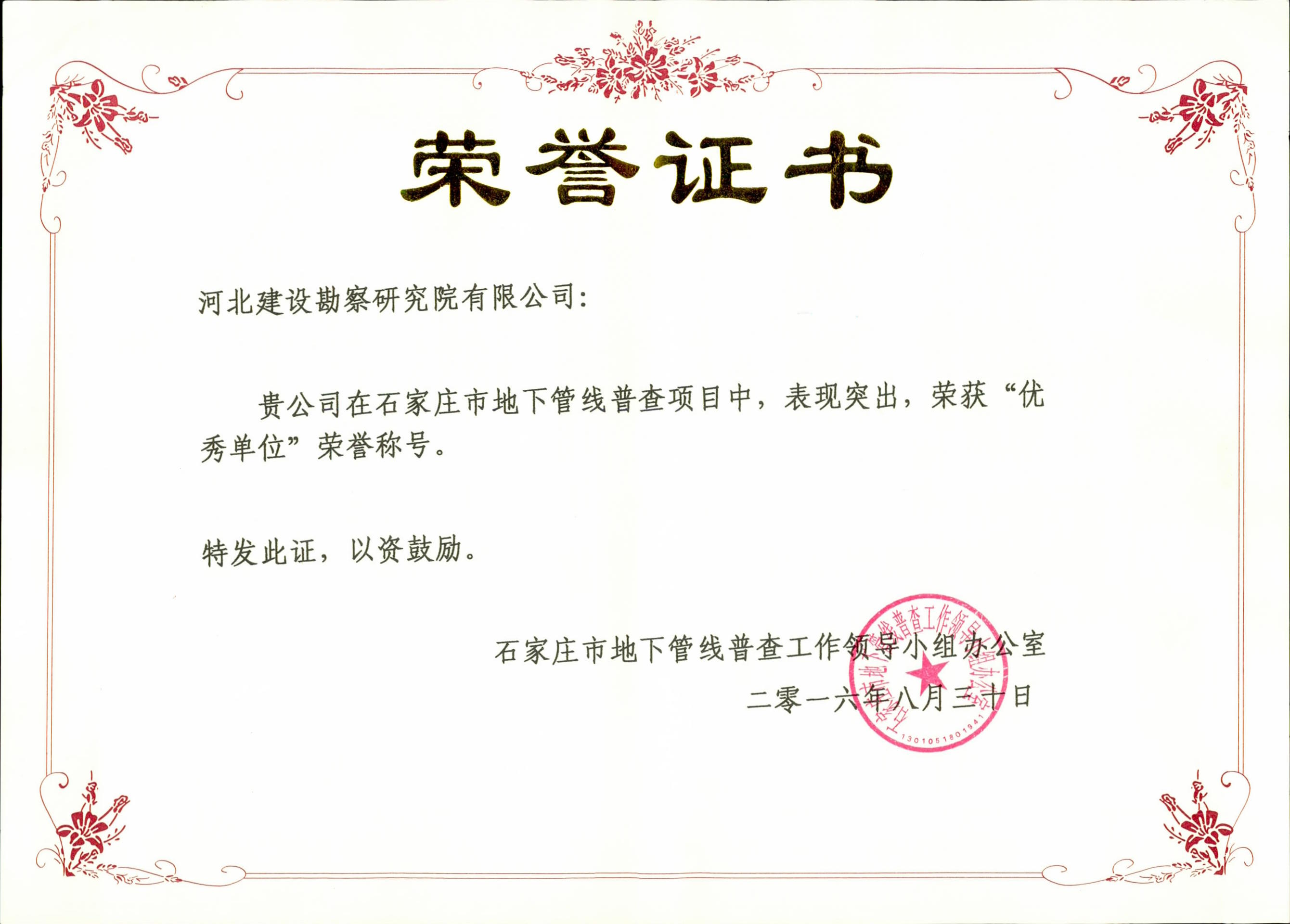 公司承擔的石家莊市地下管線普查項目于近日完工,并順利通過石家莊市地下管線普查工作領導小組檢查。石家莊市地下管線普查工作領導小組充分肯定了我公司在該項目中取得的成績和突出的表現,特頒發“優秀單位”榮譽證書,以資鼓勵。