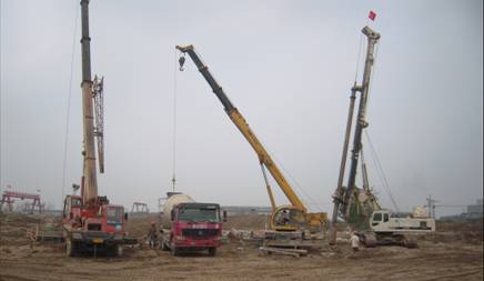 本工程樁基采用后壓漿旋挖鉆孔灌注樁,完成了高效沉降槽、種子過濾、1#、2#、3#、4#焙燒爐、電除塵、平盤過濾、預(yù)脫硅槽、高位槽、種子分解、1#、2#、3#、4#冷卻塔、1#、2#、3#鋁粉倉、棧橋、堿液調(diào)配、提升機、礦漿槽和蒸發(fā)器、礦漿槽、蒸發(fā)器、冷卻塔、堿液調(diào)配、預(yù)脫硅槽、高位槽。施工主要內(nèi)容包括:測量放線、鋼筋籠制作、運輸與吊裝、成孔、混凝土攪拌與運輸、水下混凝土灌注、后壓漿、渣土清運等。共完成直徑1000mm、800mm和600mm的灌注樁共4501根,樁身混凝土為C25和C30兩種,混凝土設(shè)計方量81773.8m3,實際灌注方量95288.0m3,平均充盈系數(shù)1.17。