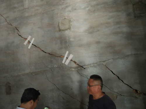 本工程勘察場地位于聊城市茌平縣,茌平華宇氧化鋁公司場內(nèi)2個(gè)堿罐與其北側(cè)2個(gè)配電室樓體周邊為本次的勘察區(qū)域。堿罐直徑8m,高10m,兩堿罐間距1.7m,現(xiàn)罐區(qū)周圍約20m×20m范圍內(nèi)土體發(fā)生膨脹,局部地面產(chǎn)生地表裂縫,兩個(gè)配電室樓體南側(cè)出現(xiàn)裂縫,裂縫位置距堿罐約30m。