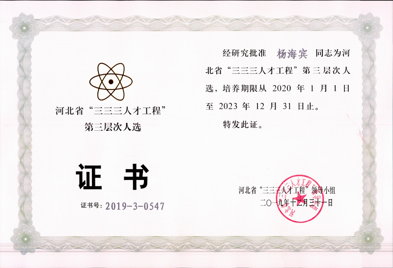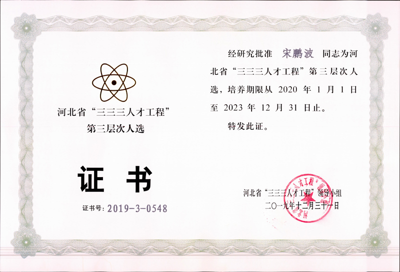 經公司推薦,石家莊市人力資源和社會保障局組織評審,省人力資源和社會保障廳備案,我公司宋鵬波、楊海賓兩位同志榮獲2019年度河北省“三三三人才工程”第三層次人選。