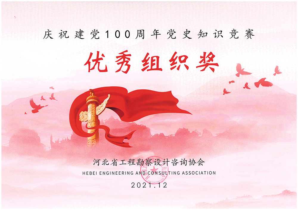 2021年,為隆重慶祝中國共產黨成立 100 周年,號召廣大黨員群眾進一步了解黨的百年奮斗史,以史為鑒,砥礪前行,為行業高質量發展作出積極貢獻,河北省工程勘察設計咨詢協會主辦了以“重溫黨史,不忘初心”為主題的黨史知識學習競賽活動。公司黨委組織公司廣大黨員群眾積極踴躍參加,并取得較好學習效果。近日,被河北省工程勘察設計咨詢協會授予“優秀組織獎”。