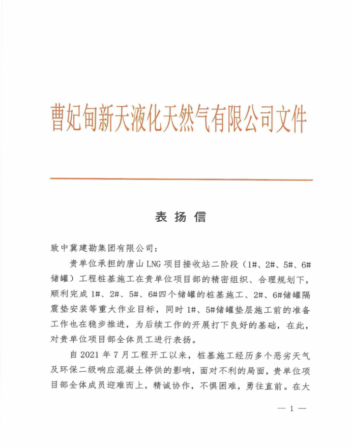 唐山LNG項目接收站二階段工程樁基工程項目部建設規模為4座20萬m³LNG儲罐,項目順利實現質量零事故、安全零事故目標,贏得總包、監理及業主的一致認可與高度肯定。