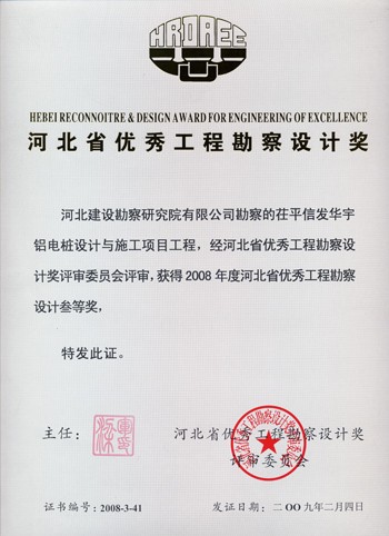 茌平信發(fā)華宇鋁電樁基設(shè)計(jì)與施工項(xiàng)目獲河北省優(yōu)秀工程勘察設(shè)計(jì)三等獎(jiǎng)。