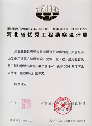 我公司承擔(dān)的浙江大唐烏沙山電廠建筑方格網(wǎng)測設(shè)、復(fù)測工程獲河北省優(yōu)秀工程勘察設(shè)計(jì)二等獎。