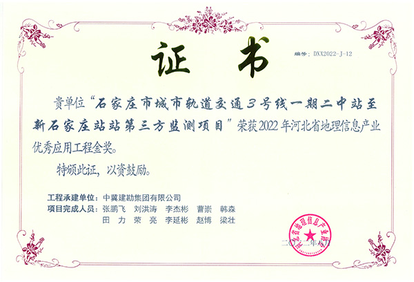 近日,由河北省地理信息產業協會評選,公司榮獲2020-2021年度河北省地理信息產業甲級測繪資質“十佳單位”榮譽稱號,赫英超同志榮獲河北省地理信息產業“優秀青年管理人才”稱號;同時石家莊市城市軌道交通3號線一期二中站至新石家莊站站第三方監測項目榮獲“2022年度河北省地理信息產業優秀應用工程金獎”。