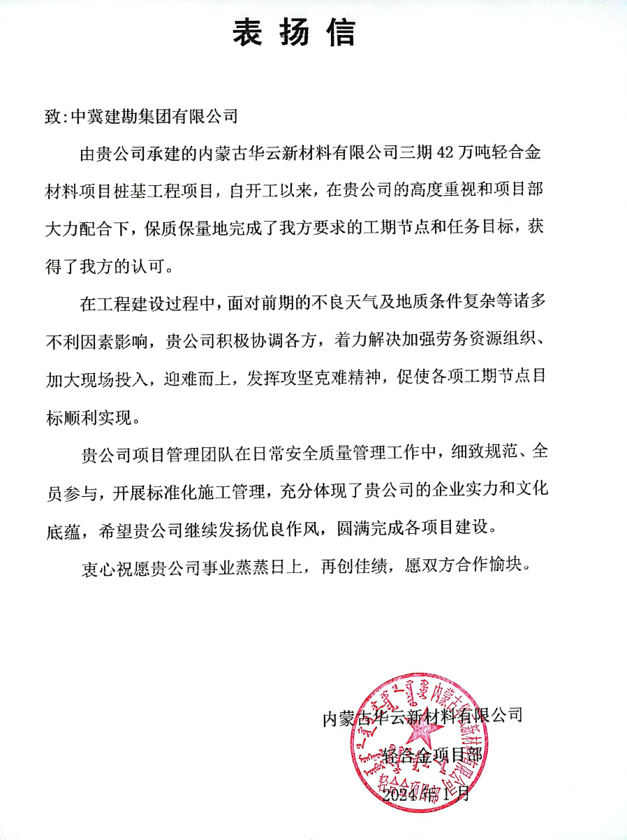 內蒙古華云新材料有限公司三期42萬噸輕合金材料項目樁基工程,在工程建設過程中,面對前期的不良天氣及地質條件復雜等諸多不利因素影響,積極協調各方,著力解決加強勞務資源組織、加大現場投入,迎難而上,發揮攻堅克難精神,保質保量地完成了工期節點和任務目標,獲得甲方的認可。