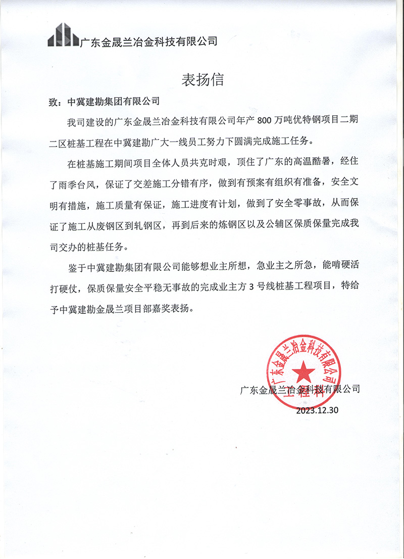 廣東金盛蘭冶金科技有限公司年產800萬噸優特鋼項目二期二區樁基工程,在施工期間項目全體人員共克時艱,頂住了廣東的高溫酷暑,經住了雨季臺風,保證了交差施工分錯有序,做到了預案有組織有準備,安全文明有措施,施工質量有保證,施工進度有計劃,做到了安全零事故,保質保量的完成任務,業主對項目給予嘉獎表揚。