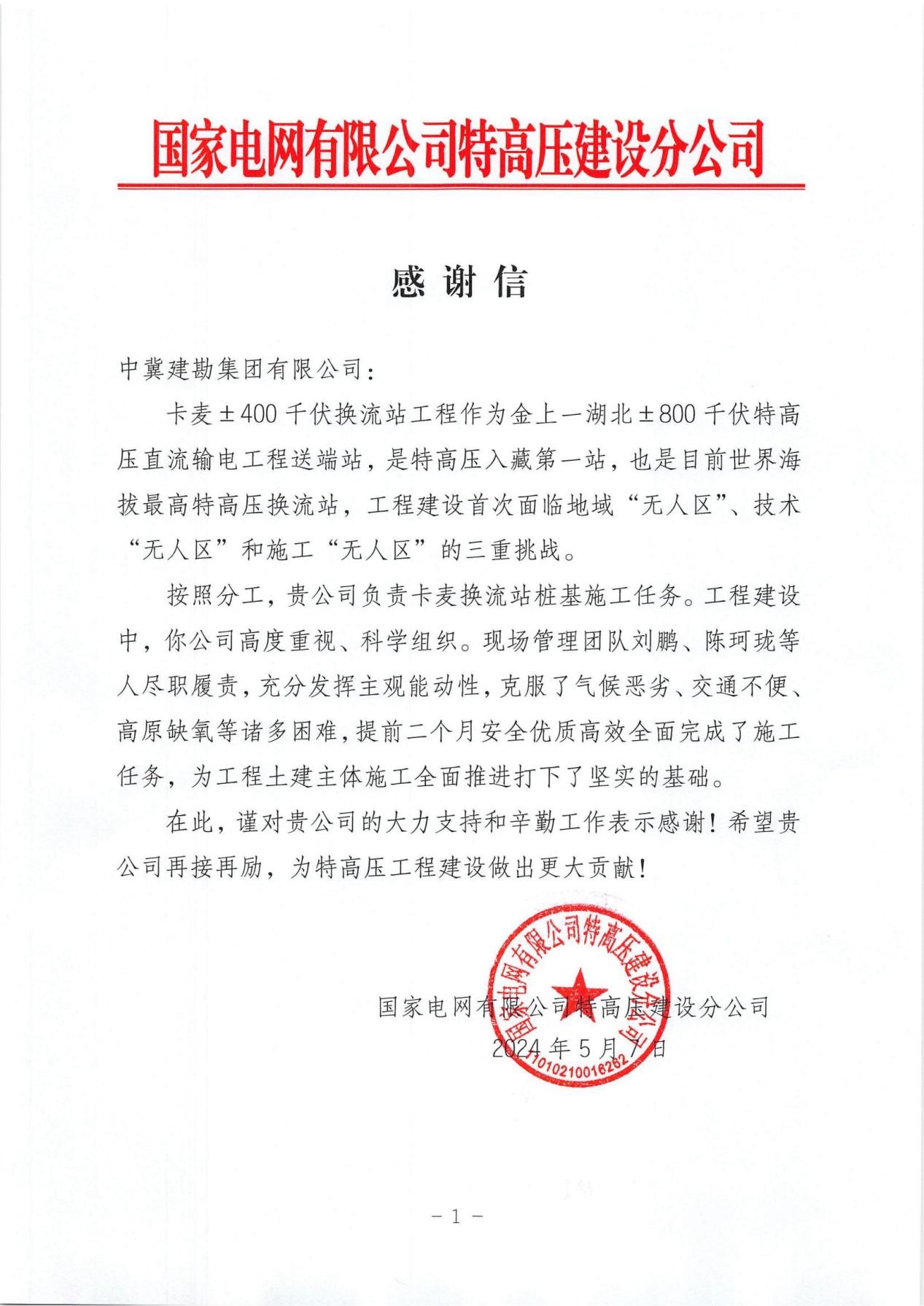 同時,業(yè)主及監(jiān)理給予了極高的贊譽與肯定,授予了我公司“優(yōu)秀承包商”的榮譽稱號;授予劉鵬同志“優(yōu)秀項目經(jīng)理”榮譽稱號;陳珂瓏同志“優(yōu)秀項目總工”榮譽稱號;紀(jì)曉蒙同志“優(yōu)秀項目副經(jīng)理”榮譽稱號;李鑫同志“優(yōu)秀安全總監(jiān)”榮譽稱號;張和平同志“優(yōu)秀項目質(zhì)檢員”榮譽稱號;魏耀文同志“優(yōu)秀項目技術(shù)員”榮譽稱號;張博杰同志“優(yōu)秀項目技術(shù)員”榮譽稱號;王美兵同志“優(yōu)秀項目施工員”榮譽稱號。此外,針對項目部在卡麥換流站做出的突出貢獻,國網(wǎng)特高壓分公司特意撰寫了一份感謝信,對于我公司的施工履約能力給予肯定和感謝,期待后續(xù)工程繼續(xù)合作,再創(chuàng)佳績!