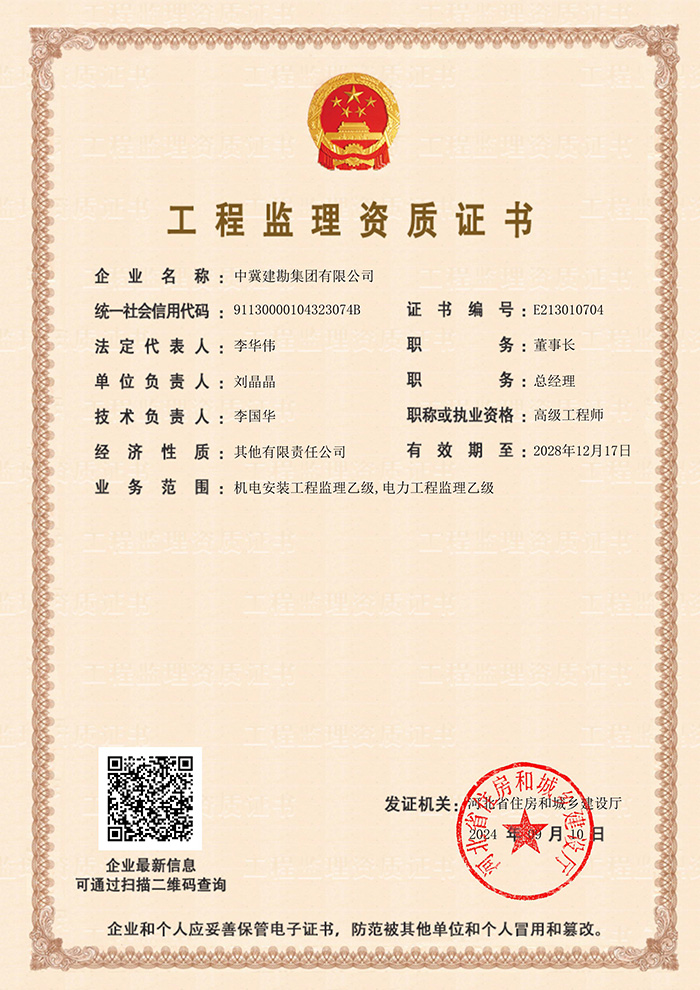 為進一步拓展公司業(yè)務(wù)范圍,完善工程監(jiān)理資質(zhì)類別,集團公司于2024年9月10日通過河北省住房和城鄉(xiāng)建設(shè)廳審核,取得了機電安裝工程監(jiān)理乙級資質(zhì)。