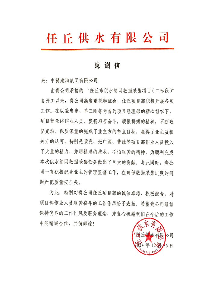 任丘市供水管網數據采集(二標段)項目,自開工以來領導十分重視,統籌安排,精心組織,項目部全體作業人員發揚艱苦奮斗,頑強拼搏的精神,不斷攻堅克難,保質保量順利完成了供水管網數據采集項目。我公司認真負責、誠信卓越、一心為業主服務的工作精神贏得了業主的高度認可和贊揚,同時對本項目表現突出的工作人員頒發了“2024年度先進工作者”榮譽證書。